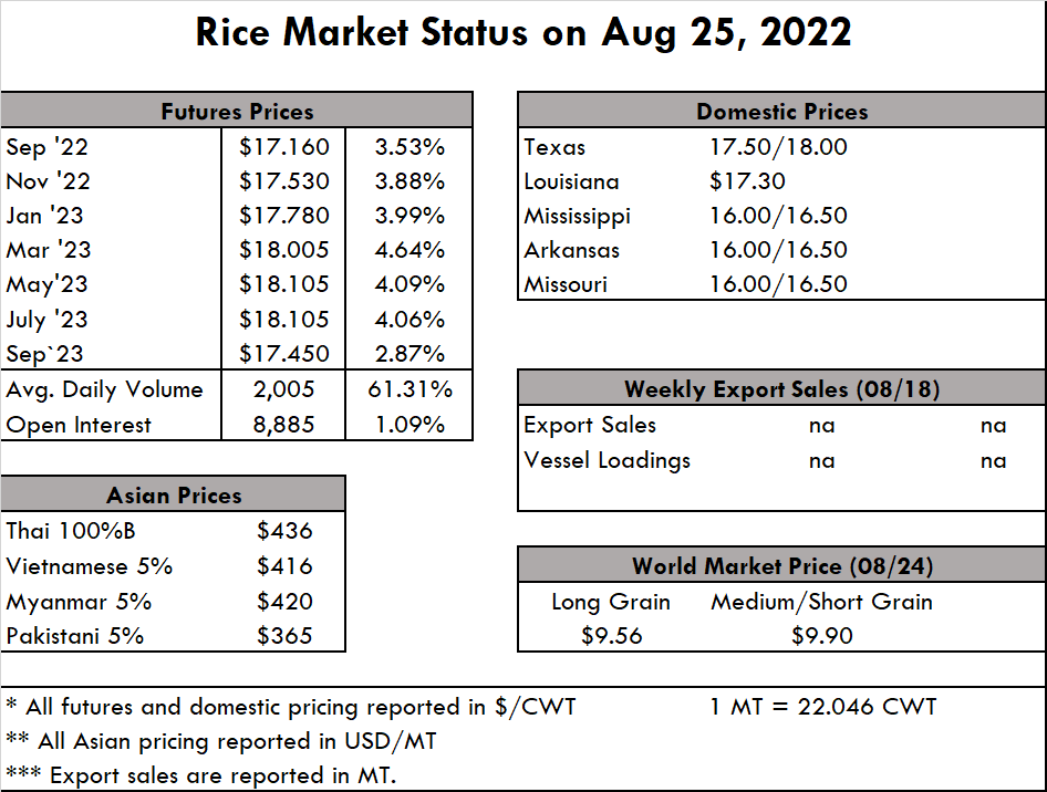 Texas is getting close to being finished, with less than 25% predicted to still be in the field, while the USDA is reporting only 66% harvested this week. Yields for hybrids have been reported as strong, but some of the conventional varieties were hit by the weather which has made the harvest season difficult. Prices have held at the $17.50/$18 range for hybrids and conventional respectively. Louisiana is also receiving rains, with prices reflecting a $17.30 price this week. Overall though, harvest is progressing smoothly and yields have been strong, with the USDA showing 60% harvested, though it’s likely at least 10% beyond that at this point. Arkansas is of course behind Texas and Louisiana, with harvest expected to start in earnest the first week of September. Producers are optimistic about their crop and have confidence it will at least be average. The USDA shows the crop is 89% headed, with 24% showing fair, 53% good, and 19% excellent.