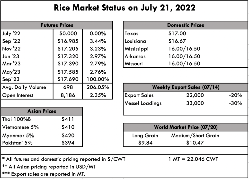 Although the cash market remains in the doldrums, that may soon change with the notable export activity that finally materialized. It was reported that Iraq recently purchased 40,000 MT of U.S. rice, or one vessel. Considering the shipping date is imminent, it will most likely aid old crop prices, and have little effect on new crop. For now, long grain paddy prices range from $16-17 per cwt depending on the location. Southern medium grain, when available, is trading between $19.50-20.50 per cwt.