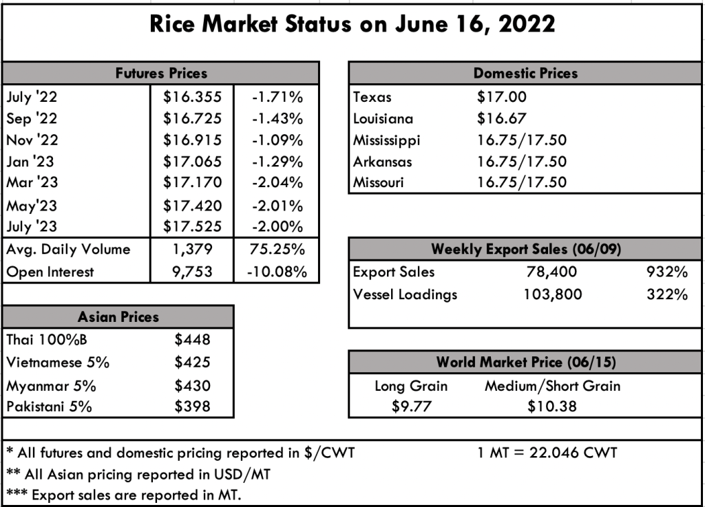 The good news is that the crop is progressing well it looks solid across all regions. Producers can take solace in that fact after a bumpy planting season plagued with volatile prices and uncooperative weather. Now that the crop is in the ground, the exporters and marketers are left to deal with an extremely difficult market environment. Export sales reports in recent weeks have been dismal, and while this week is better than previous, it is unlikely to be a new trend. Iraq has found its trading partner in Thailand for milled rice. With prices of U.S. Long Grain far outpacing that of the competition, there is not an easy path forward in the near term.