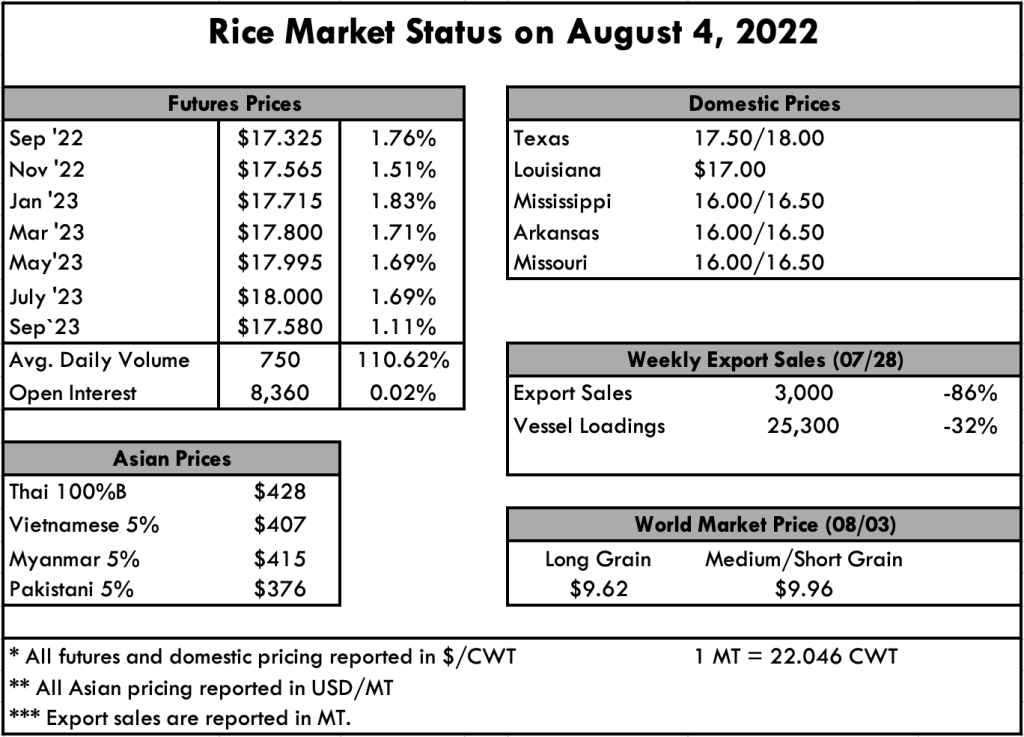 With harvesters in the field and Iraq in the market, it feels like progress. Of course, there is always hope that there will be more business from Iraq in the near future, but the mills in Arkansas are happy for the opportunity to connect on this 40,000 metric tons. By way of harvest, most reports are strong so far. There have been a few bouts of wet fields and lodging throughout the harvesting regions, but overall there is muted optimism on initial reports. In Texas, the market seems to be hovering in that $17.50/cwt range; however, since the drought has curtailed all second crop canal water, farmers not on wells are going to need a bit more than that to make ends meet this year. Some 15,000 acres of second crop estimated to be affected.