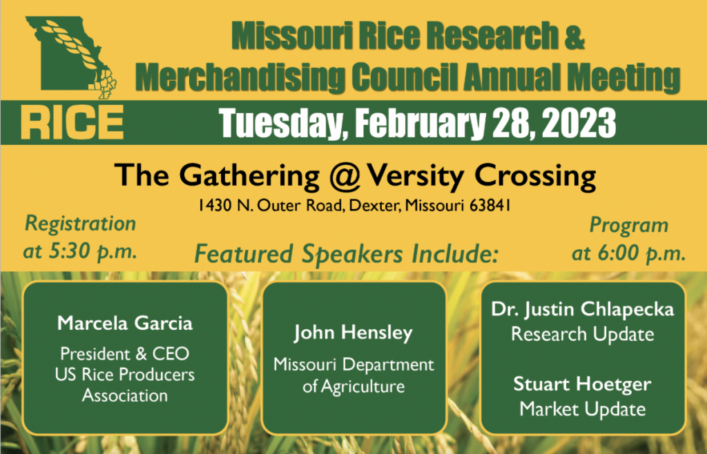 The Missouri Rice Research & Merchandising Council will host its Annual Meeting on Tuesday, February 28 at The Gathering in Dexter, Missouri. Registration begins at 5:30 p.m. and the program will begin at 6:00 p.m.